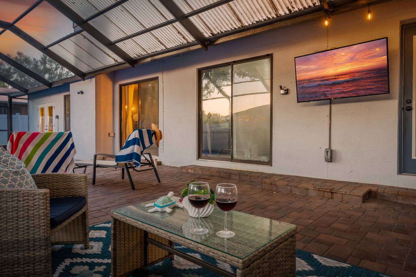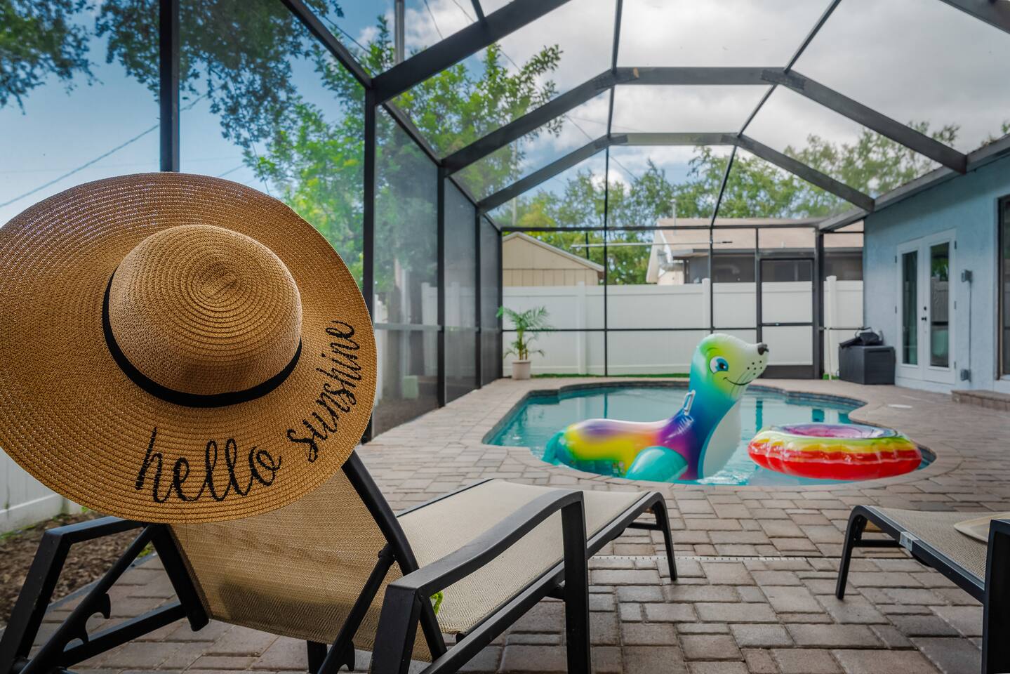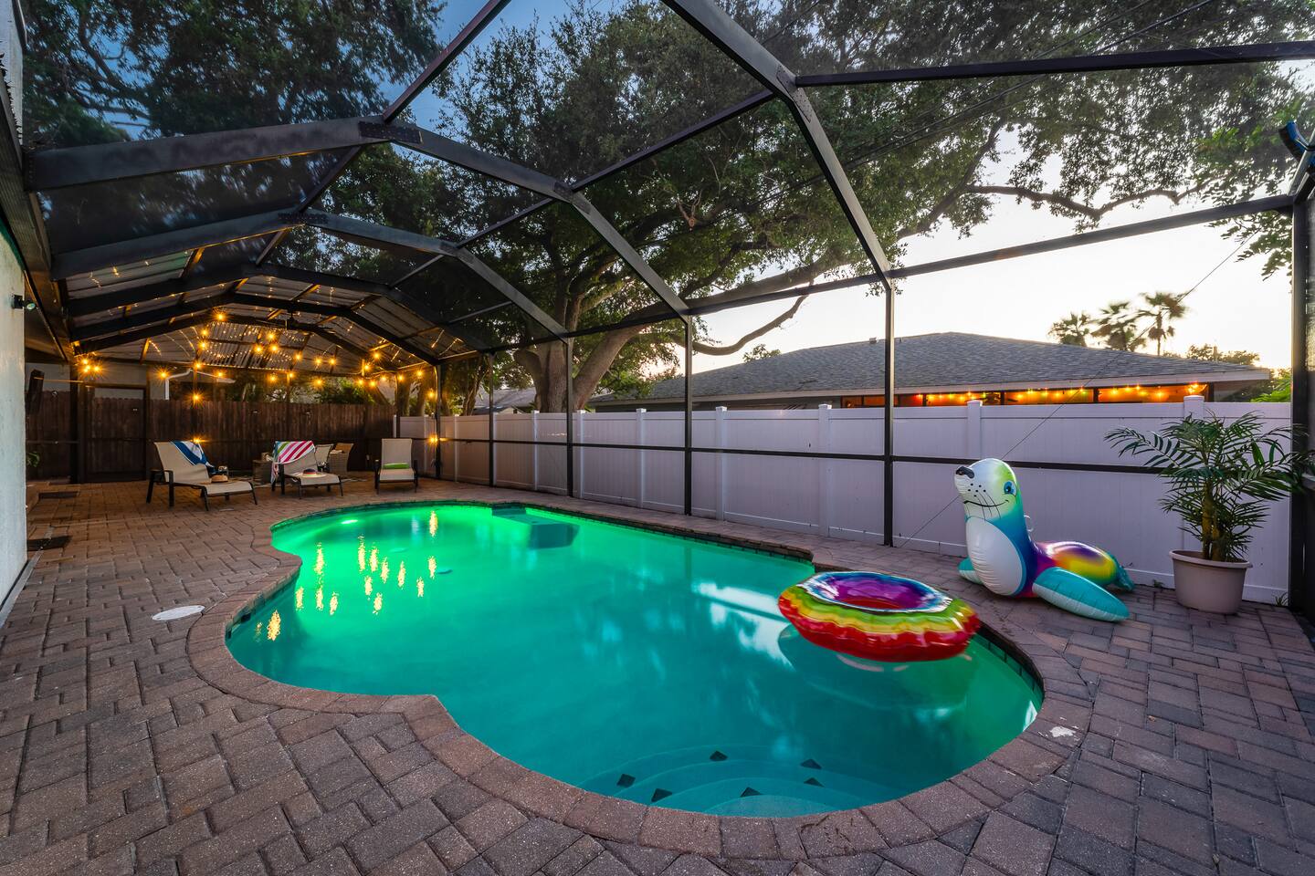 Fierce Co-Hosting Presents, The Dunedin Salt Shed! - 10 min from downtown Dunedin, Honeymoon Island, and Caladesi Island State Park. - Private Bug-Free Oasis: Unwind in your backyard retreat, free from mosquitoes thanks to the screened-in enclosure over the heated saltwater pool, outdoor loungers, smart TV, and tiki toss game. - Entertainment Ready: 3-in-1 with pool table, air hockey, ping pong table. -Upgraded Coffee Station w/ locally sourced coffee, tea, and hot cocoa!